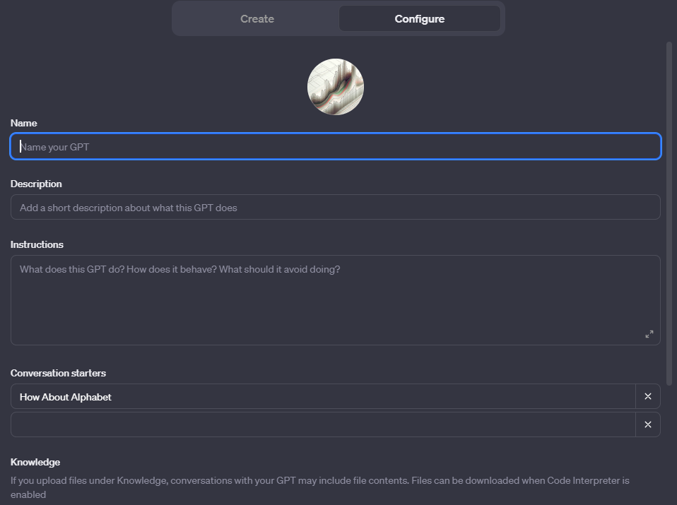 以下画像が、GPTsのConfigureの画面であるが、プロンプトが入力される"Instructions"が、ユーザーの要望に従って修正される。